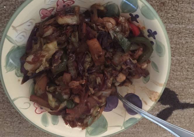 - Combine all of your vegetables into the wok a little at a time add more as your vegetables begin to cook down and wilt. Once all the vegetables have basically reduced in size by half, move to the side and add your beaten eggs until they are completely cooked through. Combine chicken with vegetables and eggs and mix well and you are ready to eat. You may certainly add a little bit more of the hoisin sauce if you need to.