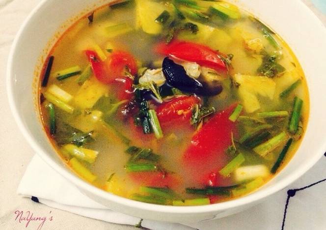 - When the soup boils, add spring onions, laksa leaves, rice paddy herbs and turn off the heat.