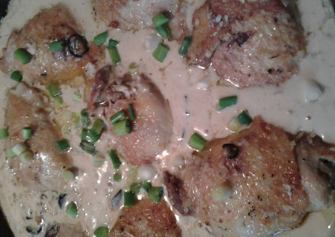- Chop the olives. Salt and pepper the chicken. Heat 1/4 cup oil and fry chicken just before being done drain most of juices and add olives and onions.