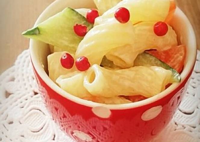 - Squeeze the cucumber to get rid of the excess water. Add the cooled macaroni and carrot into the bowl. Pour over the dressing and mix well. Season with salt and pepper if needed. You can serve it right now or let it cool in fridge and enjoy the salad cold.